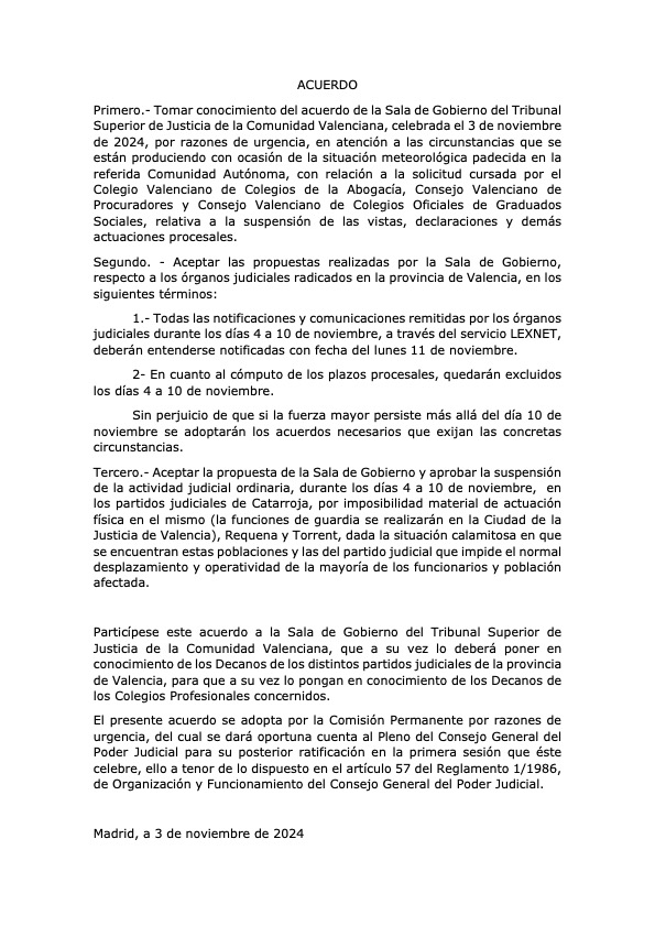 El Consejo General del Poder Judicial (CGPJ) ha acordado ratificar la solicitud del Tribunal Superior de Justicia de la Comunidad Valencia que, a petición del Consejo Valenciano de Colegios de la Abogacía y los Colegios de Procuradores y Graduados Sociales de Valencia, suspende las vistas y plazos procesales desde este lunes 4 y hasta el próximo día 10 de noviembre para la provincia de Valencia.