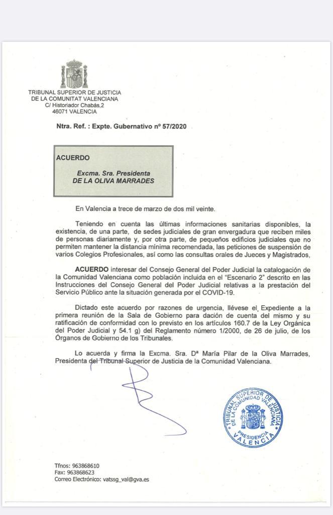 El TSJCV acuerda suspender los plazos procesales y las actuaciones judiciales no urgentes y acuerdos de Partidos Judiciales