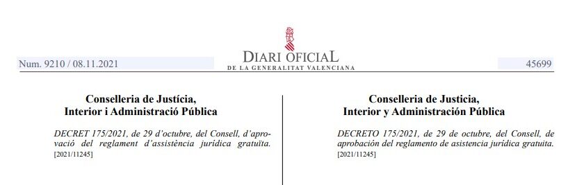 El Diari Oficial de la Generalitat Valenciana (DOGV) ha publicado hoy lunes 8 de noviembre el Decreto 175/2021, de 29 de octubre, del Consell, de aprobación del Reglamento de Asistencia Jurídica Gratuita, cuya copia se adjunta. Leer más »