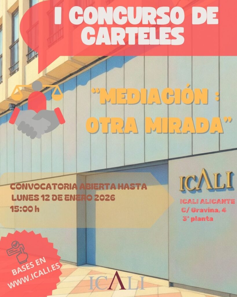 El Colegio, a través de la comisión ejecutiva de la Sección de Mediación y MASC, convoca el I Concurso de Carteles ICALI “Mediación: otra mirada”, con el objetivo de promover y dar a conocer la mediación como método de resolución de conflictos en la sociedad. Esta iniciativa se enmarca en las actividades organizadas en torno a la celebración del Día Europeo de la Mediación en el Colegio, que tendrán lugar del 19 al 21 de enero de 2026.